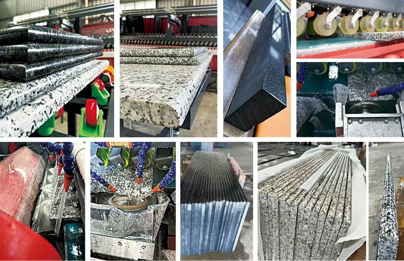 1). Fabricação de bancadas de pedra residenciais: Polimento e modelagem de bordas de bancadas de cozinha em granito/quartzo, tampos de banheiro em mármore e mesas de centro em pedra. Compatível com perfis de borda populares, como bullnose e ogee, para combinar com os estilos de interiores da casa.